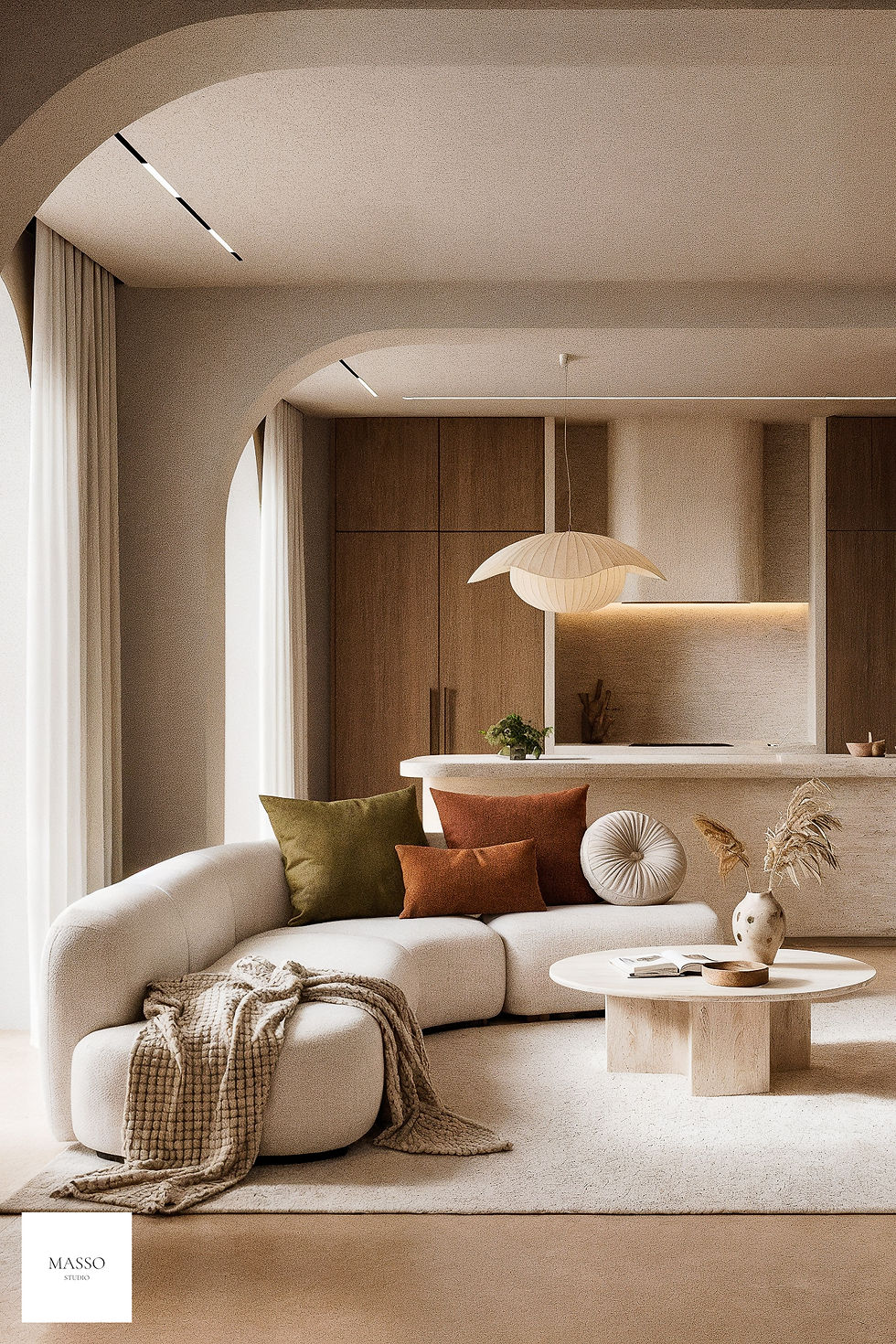 Se acabó el diseño de "museo", funcionalmente impecable pero carente de alma. La tendencia predominante es un Minimalismo Cálido que equilibra la funcionalidad con la emoción. Las líneas rígidas de años anteriores dan paso a las curvas suaves y orgánicas, que se aprecian en sofás lounge de respaldos bajos, en la fluidez de arcos que reemplazan los dinteles cuadrados de puertas y ventanas, y en detalles de mobiliario que buscan una armonía visual con la naturaleza. En este nuevo enfoque, las piezas se vuelven más robustas y voluminosas, transformándose en verdaderas piezas escultóricas: pensemos en islas de cocina monolíticas que actúan como arte o en lámparas que cumplen una doble función de luz y objeto de diseño. Este diseño más humano también optimiza la funcionalidad del día a día, promoviendo los espacios flexibles y la integración discreta y casi invisible de la tecnología inteligente (domótica invisible).